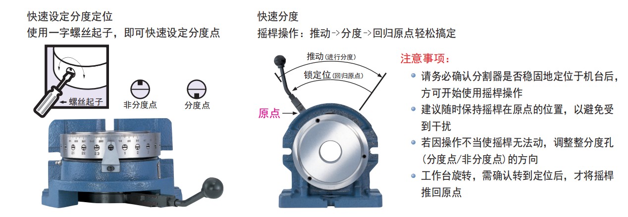 每次分度,必须确实完成操作并将摇桿回归原点,
